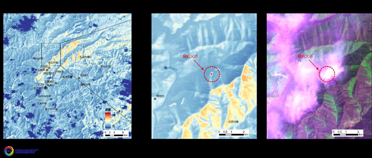 图2 康定市3月16日山火影像(左图:热红外亮温图,右图:微光遥感图)