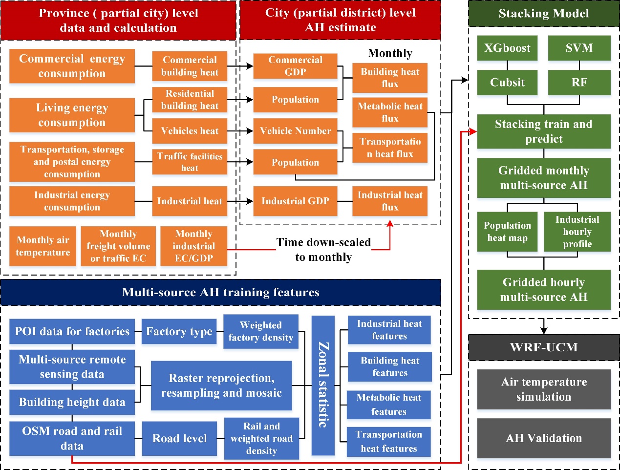 三是为克服单一算法在多源人为热建模过程中的适用性和准确性问题,研究利用Stacking框架整合多种机器学习模型,在提高精度的同时简化了建模算法的评估和选择过程。此外,研究用于建模的人为热样本数量和有效值范围均大于以往研究,且包含时间变异信息。