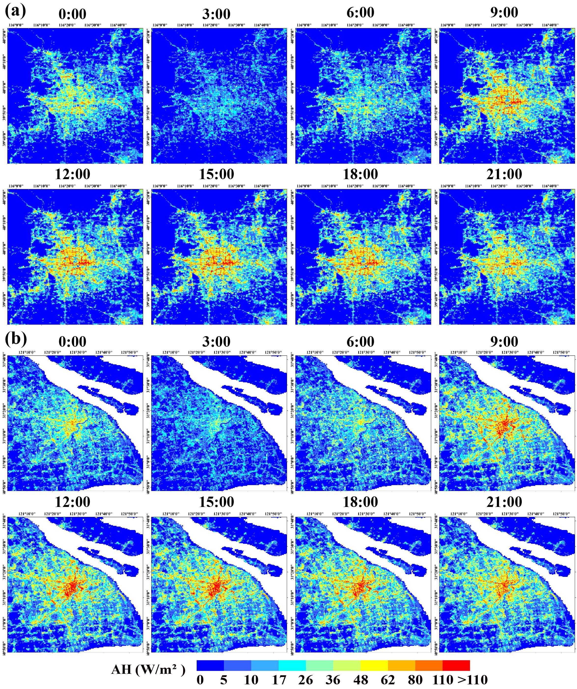图4 四月份(a)北京和(b)上海当地时间每小时人为热