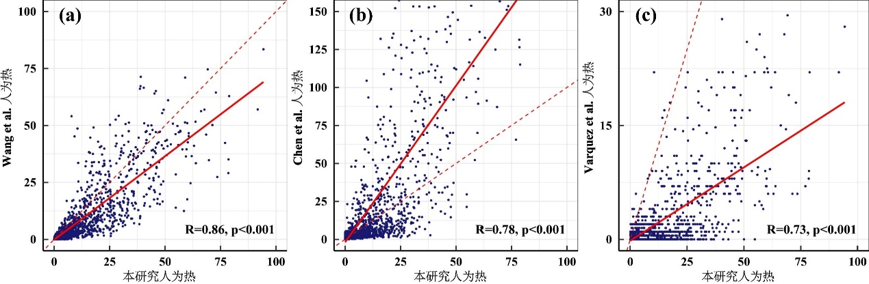 图6 本研究与 (a) Wang et al. (2022b)、(b) Chen et al. (2020)、(c) Varquez et al. (2021) 在北京建成区的人为热相关图。