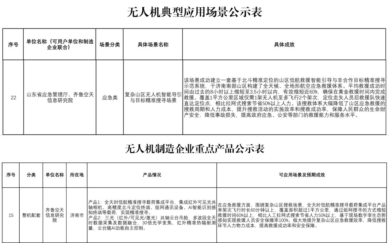 4月18日,齐鲁空天信息研究院(齐鲁院)团队联合山东省应急管理厅报送的“复杂山区无人机智能导引与目标精准搜寻场景”,以及协同中国科学院空天信息创新研究院(空天院)航空遥感中心研制的“全天时低航精准搜寻载荷集成平台”“三光(红外/可见光/激光)共轴AI云台吊舱”产品,均入选山东省工信厅无人机典型应用场景和无人机制造企业重点产品。