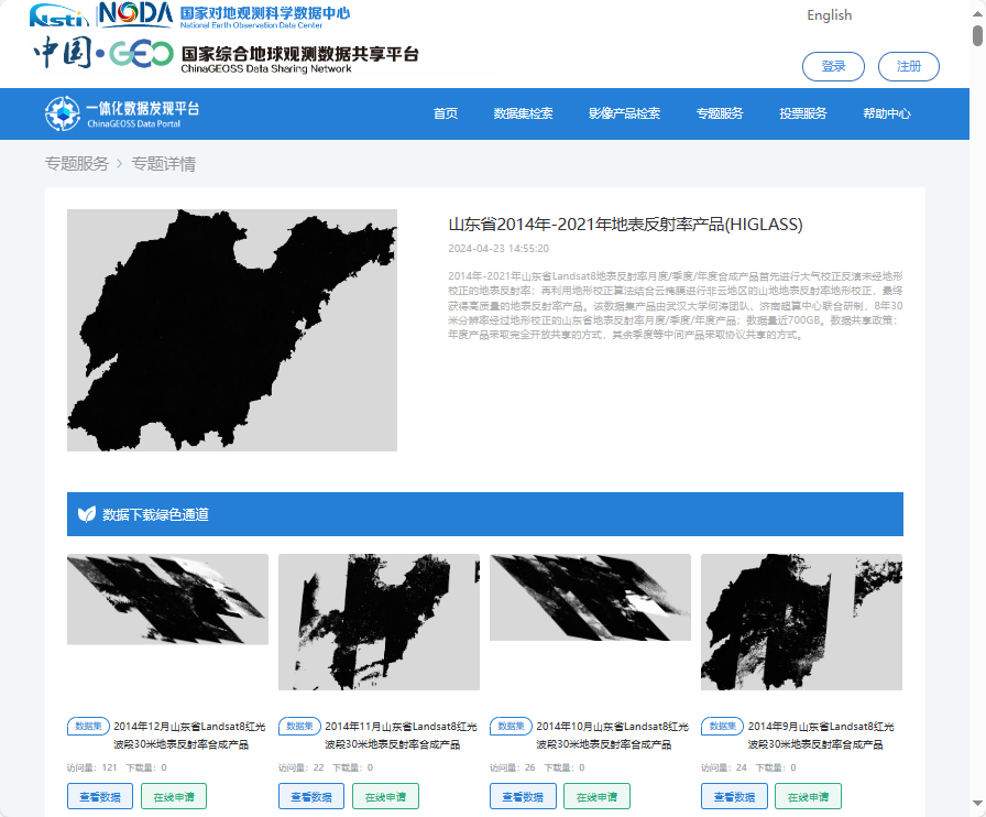 山东省2014 -2021年地表反射率产品(HIGLASS)数据集共享专题界面