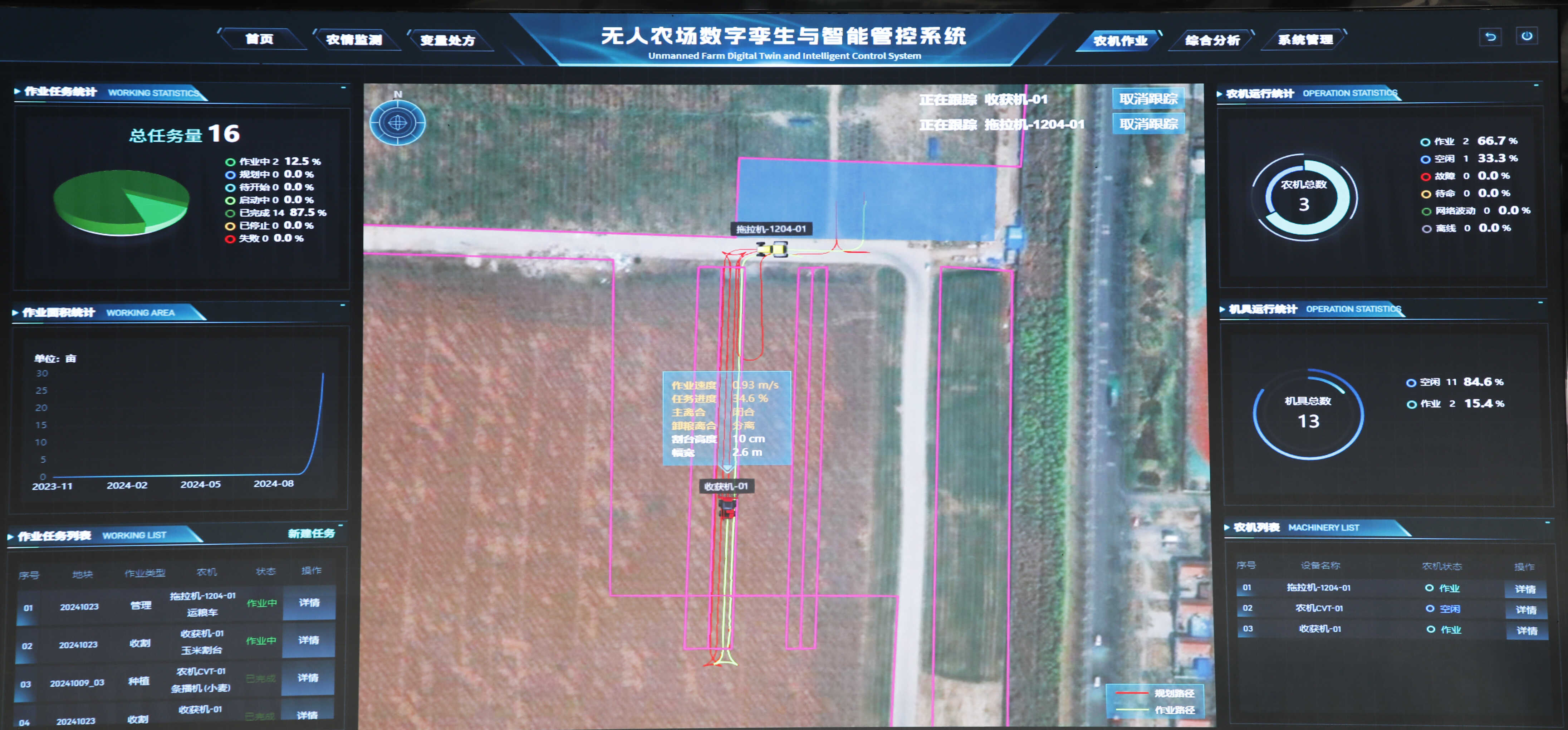 在“北斗星动能”科技示范工程支持下,空天院组织国内10余家单位经过两年多技术攻关,在农情参数空天地多手段联合感知与融合处理、“北斗+天通”自动驾驶高精度定位导航、农机具变量作业与质量精准监测等方面取得重大突破,成功研发3类全场景无人农机、10类配套变量作业智能机具等先进装备以及无人农场数字孪生与智能管控系统等,依托“北斗精准导航与高分遥感综合服务平台”,构建了千亩级空天信息赋能全场景全流程的无人农场。在同期举办的“空天信息赋能精准农业现场观摩会”上,与会者共同见证了天地一体化农情监测、玉米收获运粮协同作业、深翻作业、小麦条播变量作业等无人精准管理过程。