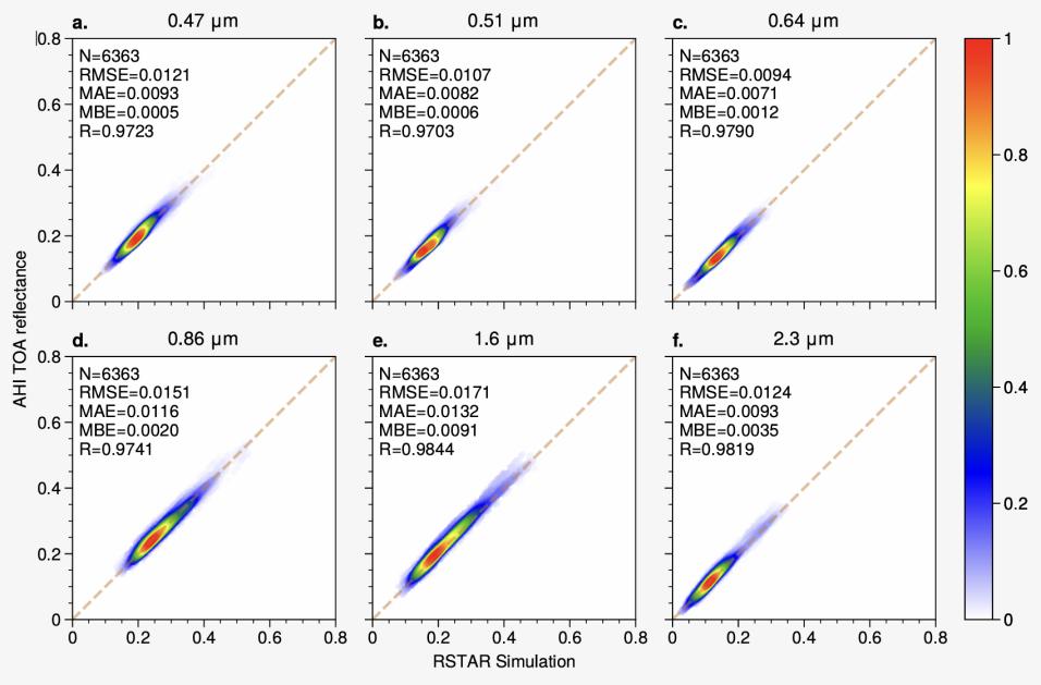 图1 AHI观测与辐射传输模型模拟的第1-6波段大气顶层表观反射率对比