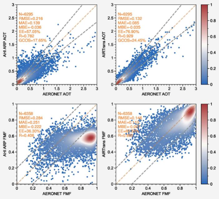 图2 AHI官方反演与AIRTrans算法AOT及FMF的AERONET验证对比结果