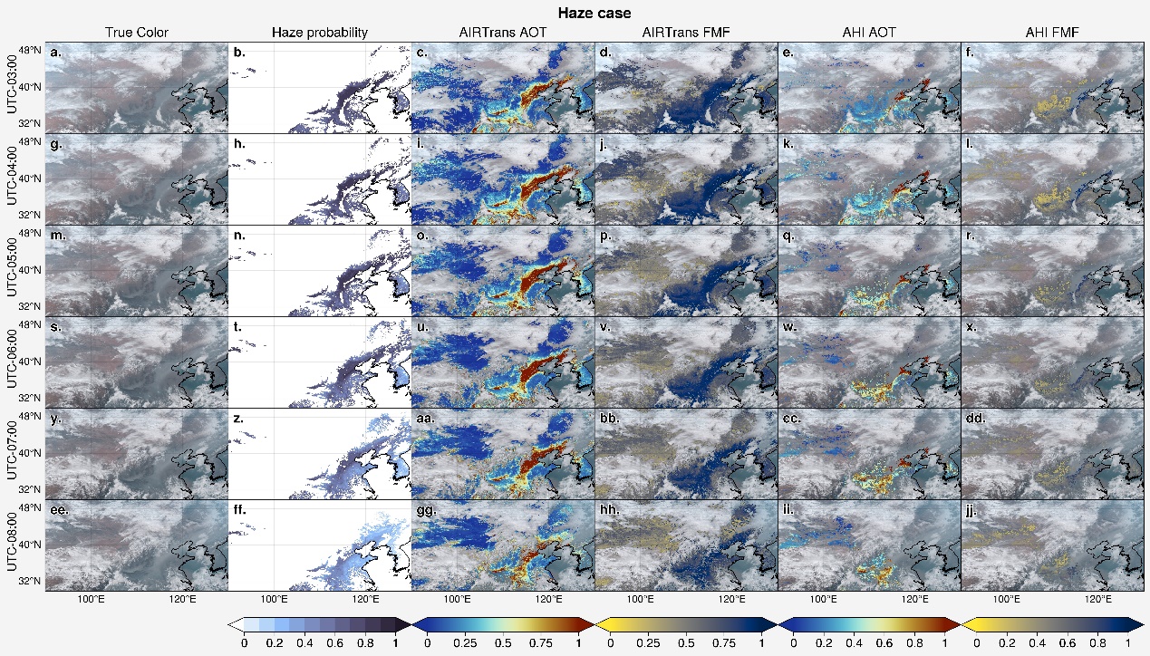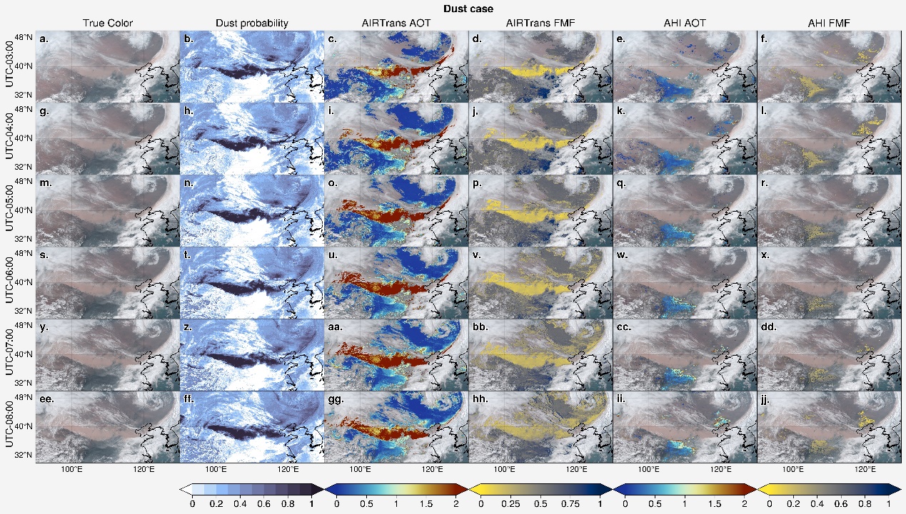 第1-6列依次展示AHI真彩色合成图、沙尘概率、AIRTrans反演的AOT及FMF、JAXA官方产品的AOT与FMF