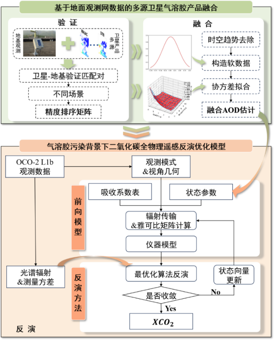 为此,研究团队基于地面观测网数据融合多源卫星遥感气溶胶产品,提升了人为源碳排放区域气溶胶散射效应表征能力,构建了气溶胶污染背景下的二氧化碳全物理遥感反演优化模型(图1)。