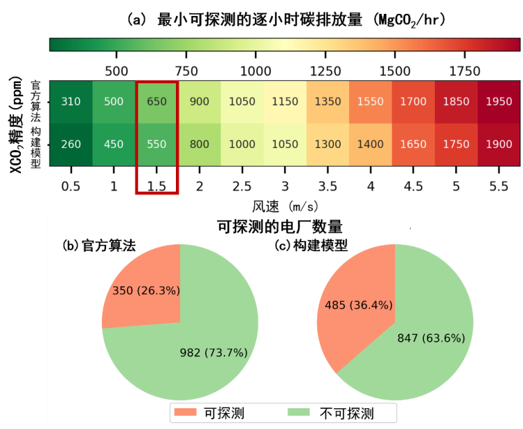 结果表明,气溶胶污染背景下,构建的模型二氧化碳柱浓度遥感反演精度达到1.68 ppm(图2),将点源最小可探测排放阈值降低为550 MgCO₂/hr(1.5m/s风速条件下)。以燃煤电厂为例,相对于OCO-2碳卫星产品,全球可监测的电厂数量提升39%(图3)。