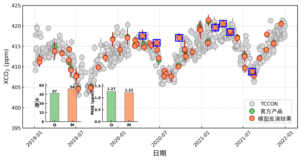 (蓝色方框标示构建模型相较OCO-2官方产品增加的反演数据)