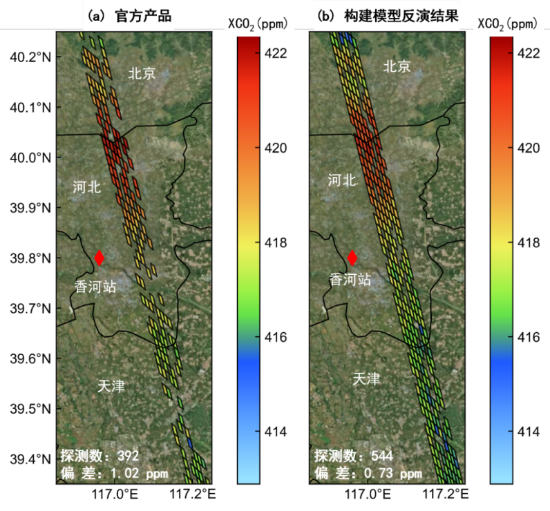 研究人员将模型应用于京津冀区域二氧化碳柱浓度遥感监测,并选用全球总碳柱观测网(TCCON)站点-香河站定量评估模型在该区域的适用性。结果表明,该模型在高质量产品数量上相对于OCO-2官方产品提升了15%(图4)。图5显示了气溶胶污染背景下(光学厚度为0.43)京津冀区域的二氧化碳柱浓度空间分布情况,与OCO-2碳卫星产品相比,精度提升了28%,高质量监测产品数量增加了39%。