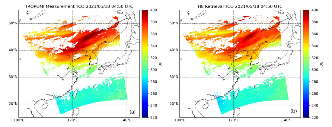 研究人员基于H8卫星的AHI多光谱相机在9.6µm波长处设置了一个可用于臭氧监测的臭氧吸收光谱波段,开发了一个全连接的神经网络模型NNO3-G。该模型是利用ERA5 TCO数据进行训练,从而在H8图像的无云区域反演TCO,其TCO产品具有2km的高空间分辨率和10 min的高时间分辨率(图1)。