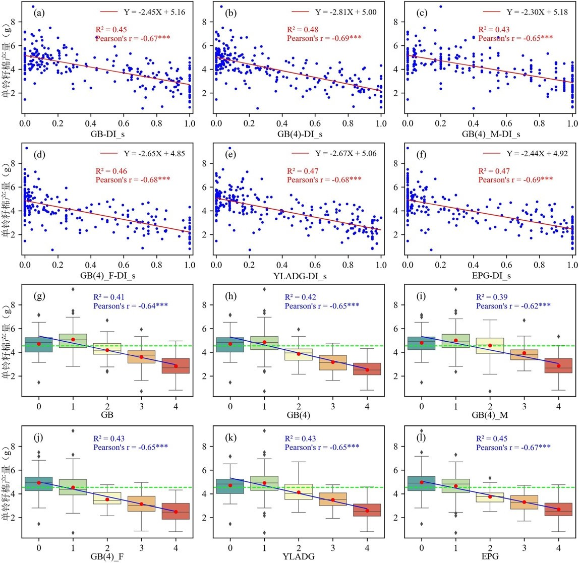 图3 不同棉花黄萎病病情分级方法与产量的响应关系(绿色虚线代表健康棉花单铃籽棉平均产量);显著水平:*** (p < 0.001)