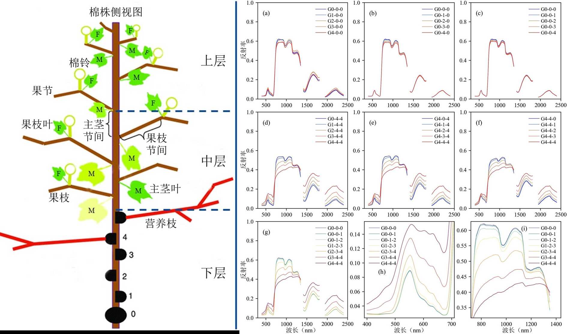 图4 棉花分层结构示意图及mSCOPE模拟的棉花黄萎病不同垂直分布模式下冠层光谱:(a)SE1;(b)SE2;(c)SE3;(d)SE4;(e)SE5;(f)SE6;(g)SE7;(h)和(i)为(g)的局部放大图;G0-1-2指棉花上、中、下层黄萎病病级分别为G0、G1和G2,其他同理