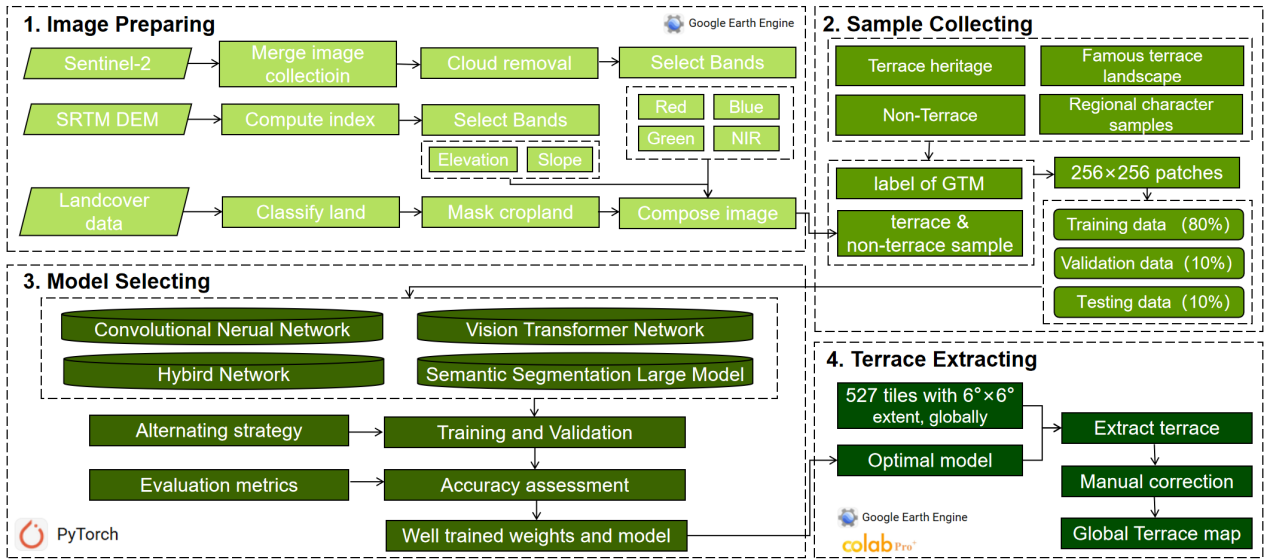 研究团队考虑到全球梯田的差异性和多样性,研究评估了8种深度学习模型,包括卷积神经网络模型、视觉Transformer模型、混合模型和语义分割大模型等,以确定梯田识别的最佳模型,进一步将最优模型应用于Google Colab Pro +云计算平台,实现梯田精准提取。