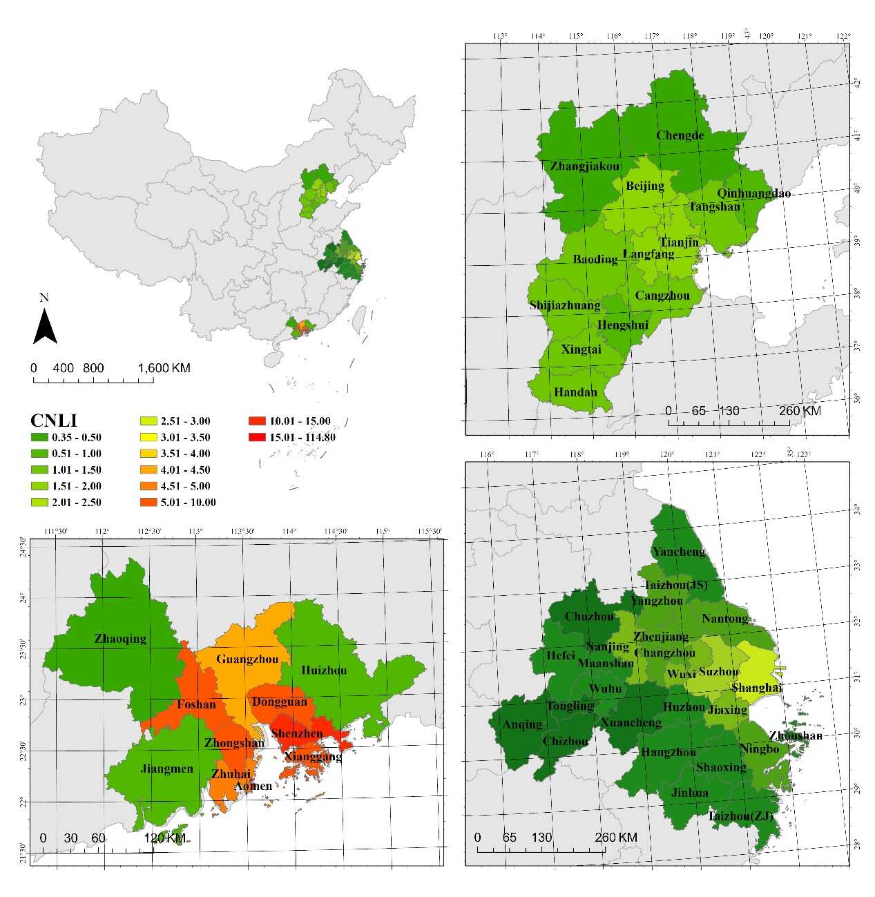 研究团队利用SDGSAT-1卫星获取的10米高分辨率夜光数据,系统分析中国京津冀、长三角和粤港澳大湾区三大城市群的人类活动特征。研究基于复合夜光指数(CNLI)构建了城市活力指数(CAI)和人口活力指数(PAI),从空间开发、经济活力和人口集聚等多维度刻画城市发展水平。