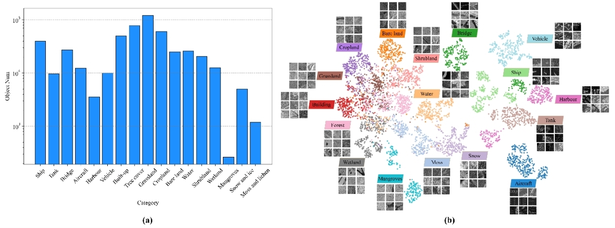 图2 SARCAP 数据集的分布与可视化结果。(a) SARCAP 各类别的样本数量分布。(b) 基于 UMAP 的降维可视化。每个类别随机选取 2,000 个样本进行展示。聚类的颜色与对应类别的文本标签颜色一致。每个标签附近展示的示例图像块为该类别中随机选取的样本