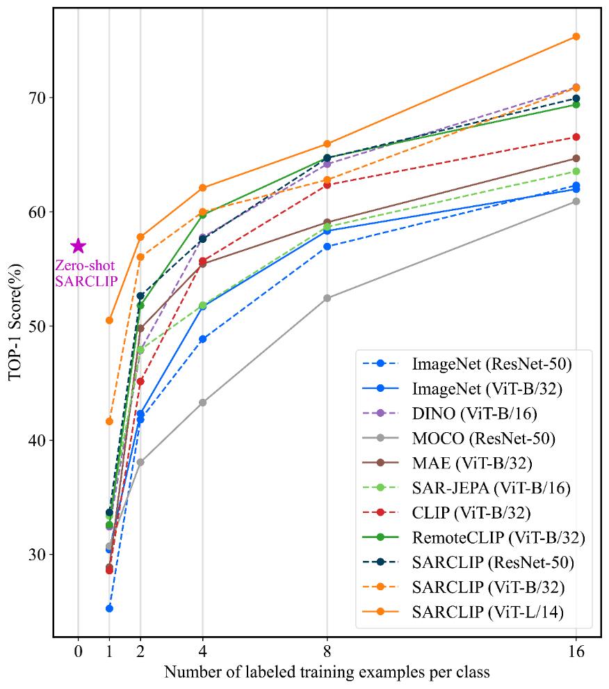 图4 不同训练样本数量下的小样本分类结果。曲线展示了 11 种不同模型在多种 SAR 数据集上的平均准确率变化趋势