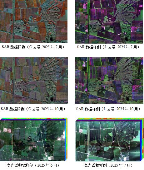 本次试验构建了覆盖广、精度高、维度全的航空观测数据获取体系,形成了多载荷、宽频谱、高分辨率的多时相航空遥感数据集,数据量达51.07TB。其中,光学多光谱数据最高几何分辨率达 0.08米,可清晰识别作物株型与田间细节;高光谱数据几何分辨率优于0.75米/1.5米(可见近红外波段/短波红外),光谱分辨率优于5纳米,可精准反演土壤有机质、作物叶绿素等关键参数;激光雷达数据点云密度优于5点/平方米,可高效获取农田地形地貌与作物三维结构信息;SAR数据几何分辨率优于1米,基于多波段与全极化联合,可实现作物类型精准识别与农情参数定量反演。