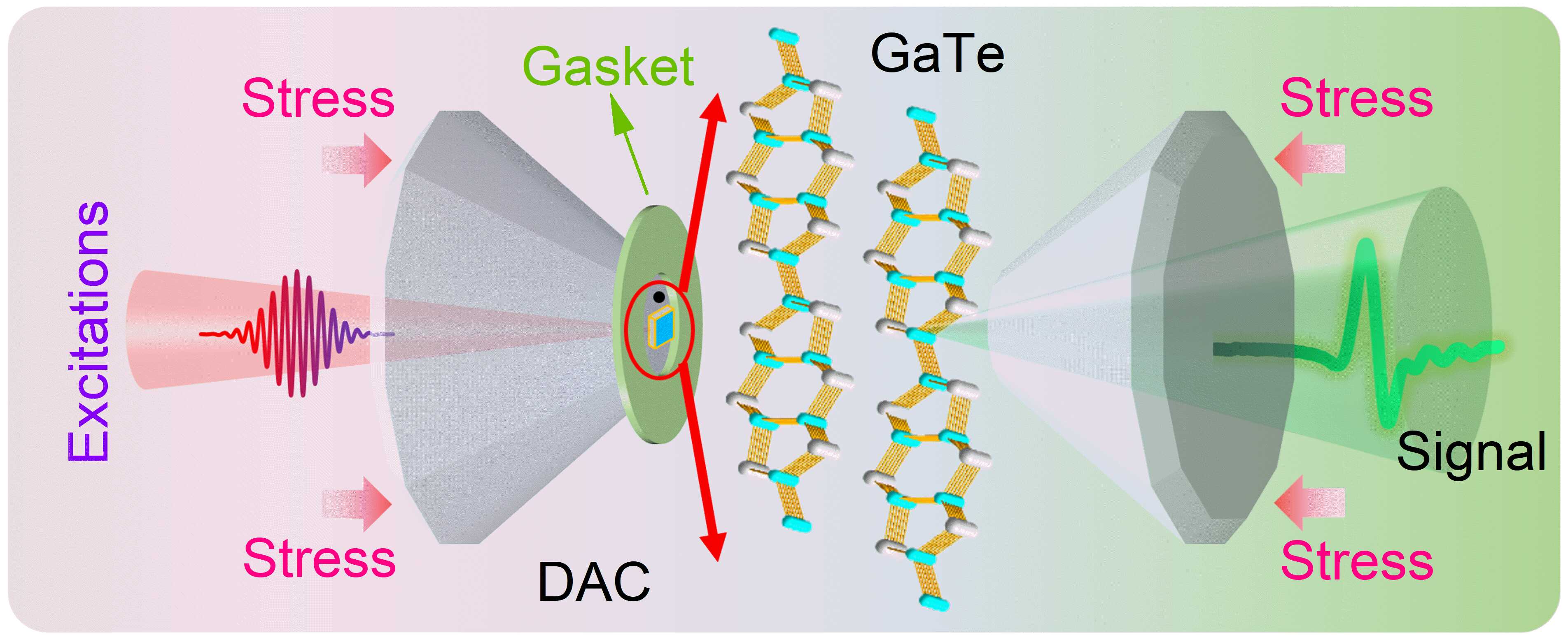 在研究中,中国科学院院士吴一戎、大湾区院研究员方广有、大湾区院研究员王天武团队在国际上率先利用金刚石对顶砧作为强大的原位调控工具,直接利用二维半导体GaTe的晶格与电子结构,研究压力效应对材料太赫兹发射效率和机制的影响。
