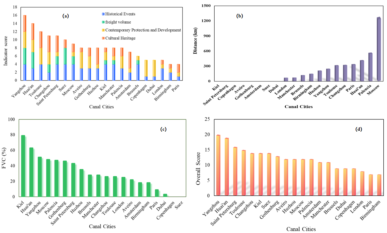 该研究发现:在文化旅游方面,中国运河城市(如扬州、淮安)因深厚的历史底蕴和持续的当代保护发展而获得较高分数,部分欧洲运河城市(如巴黎、哥本哈根)因货运功能衰退及当代活动影响力有限,反而排名相对靠后。在交通运输方面,拥有直接出海口的城市(如阿姆斯特丹、苏伊士)具有显著优势,而莫斯科这样的内陆城市,因通航距离超过1000公里,在交通便捷度上处于劣势。在生态环境方面,基尔和淮安的运河沿线植被覆盖度高,生态价值突出,哥本哈根与苏伊士等城市则获得较弱评分,可能对生态可持续性形成挑战。据此,扬州和淮安凭借各维度的均衡表现位居全球前列,领先于部分因发展不均衡而位居其后的国际名城。