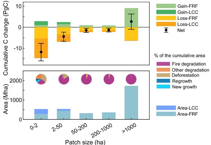 1月7日,《自然》(Nature)期刊在线发表了题为“小规模持续的湿润森林损失主导了热带森林生物量损失”(Small persistent humid forest clearings drive tropical forest biomass losses)的论文。该成果基于高分辨率的森林扰动和生物量数据,构建了格点尺度的森林扰动植被恢复数据库,并在此基础上开发了一个集成高分辨率遥感数据和森林扰动恢复数据库的森林碳簿记模型。利用该模型估算了1990-2020年间森林扰动导致的植被碳储量时空变化动态,明确了不同干扰类型和扰动斑块大小对森林植被碳储量及碳密度变化的具体贡献。该模型突破了传统簿记模型长期依赖区域尺度响应曲线的方法瓶颈,通过引入空间明确的碳库恢复曲线,显著提升了对森林空间异质性和扰动响应过程的刻画能力。法国气候与环境科学实验室(LSCE)博士后徐伊迪为论文第一作者,清华大学地球系统科学系副教授李伟与法国气候与环境科学实验室教授菲利普·西亚斯(Philippe Ciais)为论文共同通讯作者,中国科学院空天信息创新研究院研究员何国金为论文的合作作者之一。