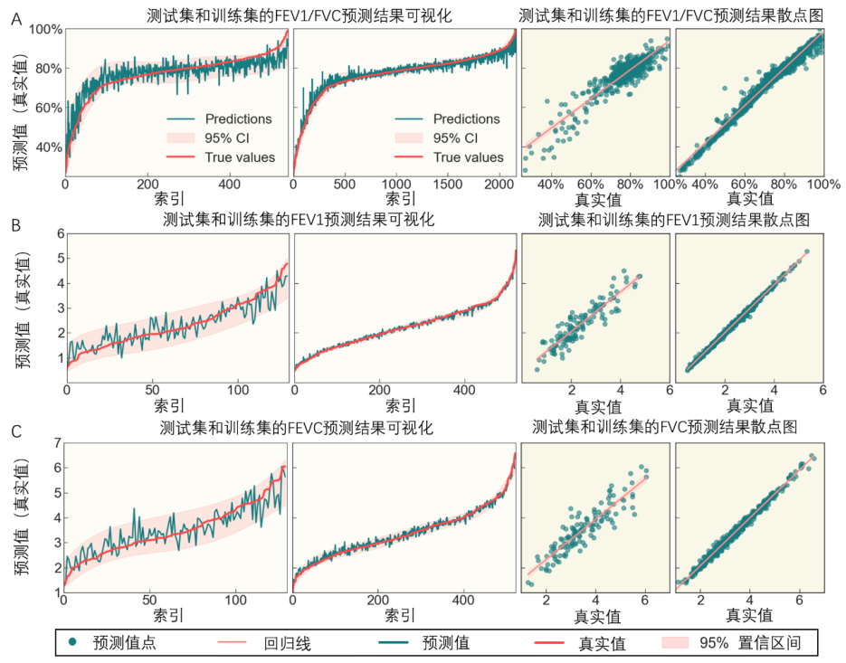 实验结果显示,模型可精准预测多项肺功能关键指标:一秒率(FEV1/FVC)的平均绝对误差(MAE)为3.78%;第一秒用力呼气容积(FEV1)的MAE为0.235L;用力肺活量(FVC)的MAE为0.264L(图2)。