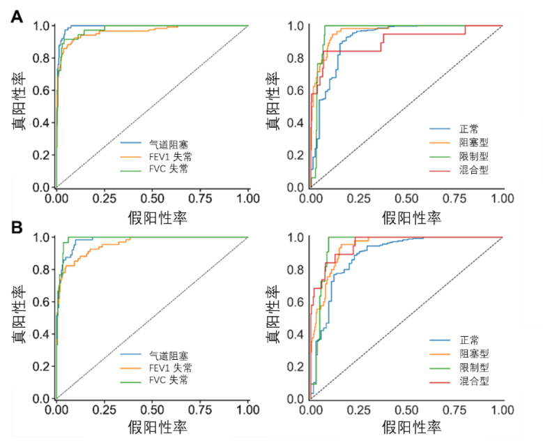 此外,该模型在呼吸系统疾病初筛中表现优异:检测气道阻塞时,曲线下面积(AUC)达0.989,灵敏度为73.97%;识别四种通气功能障碍模式时,AUC达0.938,灵敏度为76.41%(图3)。综合对比表明,其评估性能显著优于传统参数化肺功能评估方法。