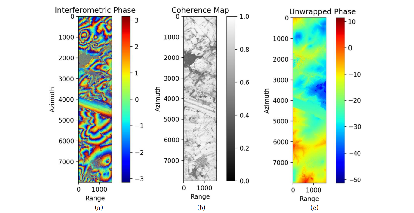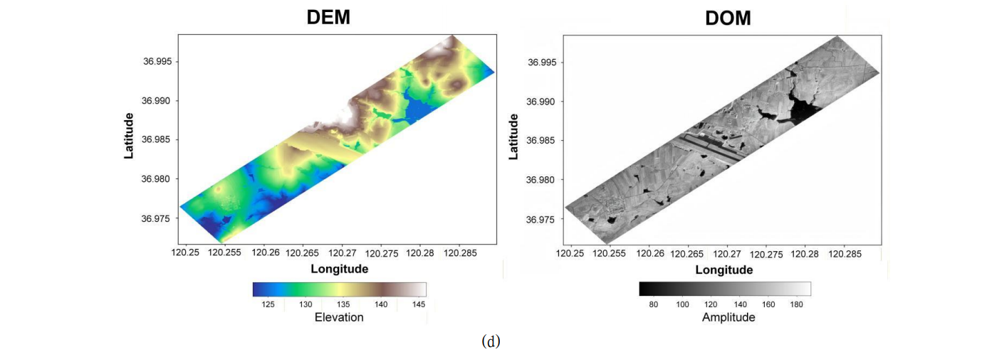 重复飞行(4米垂直基线)干涉相位图(a),干涉相干系数图(b),解缠相位图(c),数字高程模型和正射图像(d)