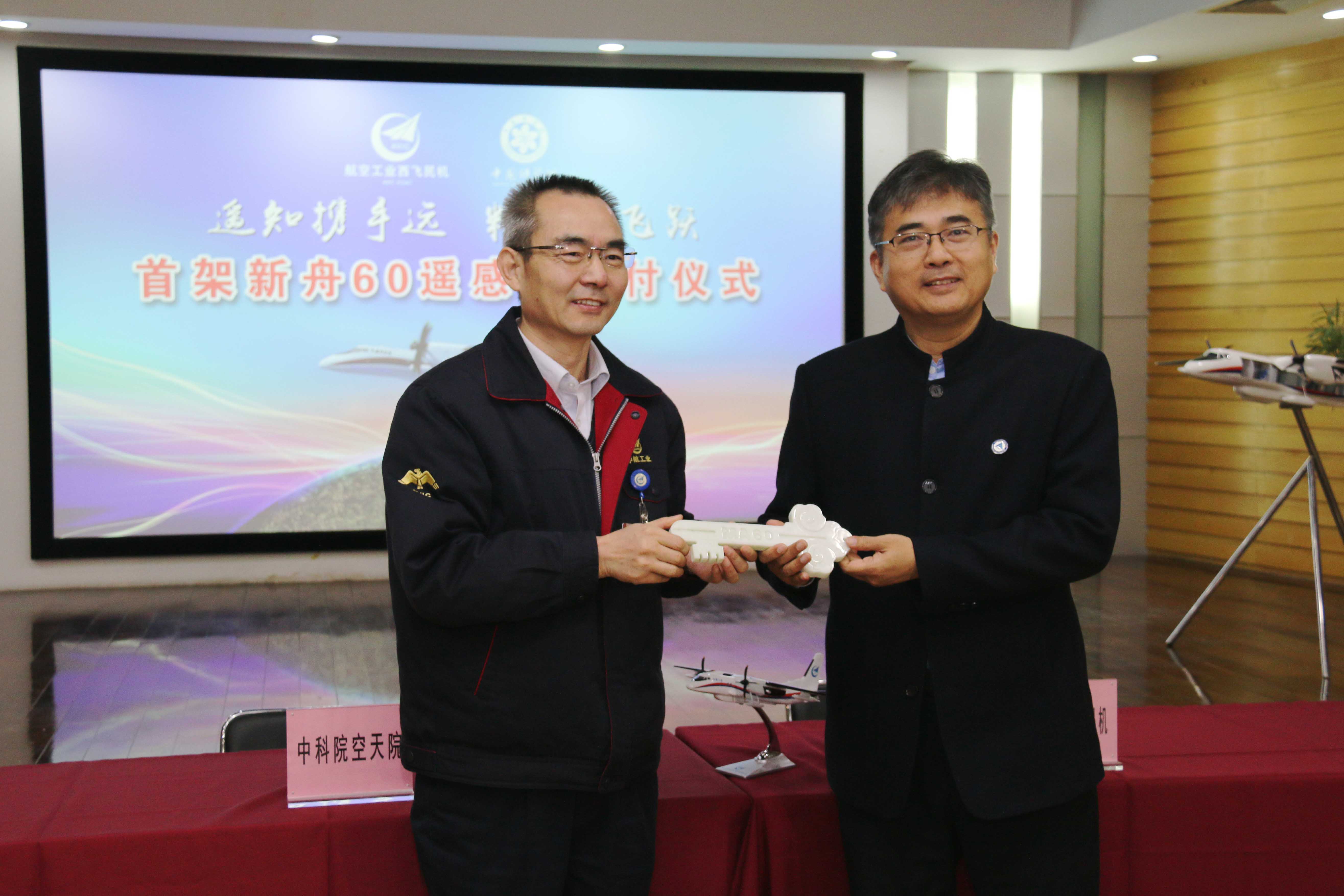 在交付仪式上,新舟60遥感机总设计师丁亚修就项目研制工作进行了汇报,丁赤飚与西飞民机副总经理朱建新代表双方签署了飞机交接证书,西飞民机总经理王程宽向吴一戎赠送了象征开启新舟60遥感机的玉钥匙。