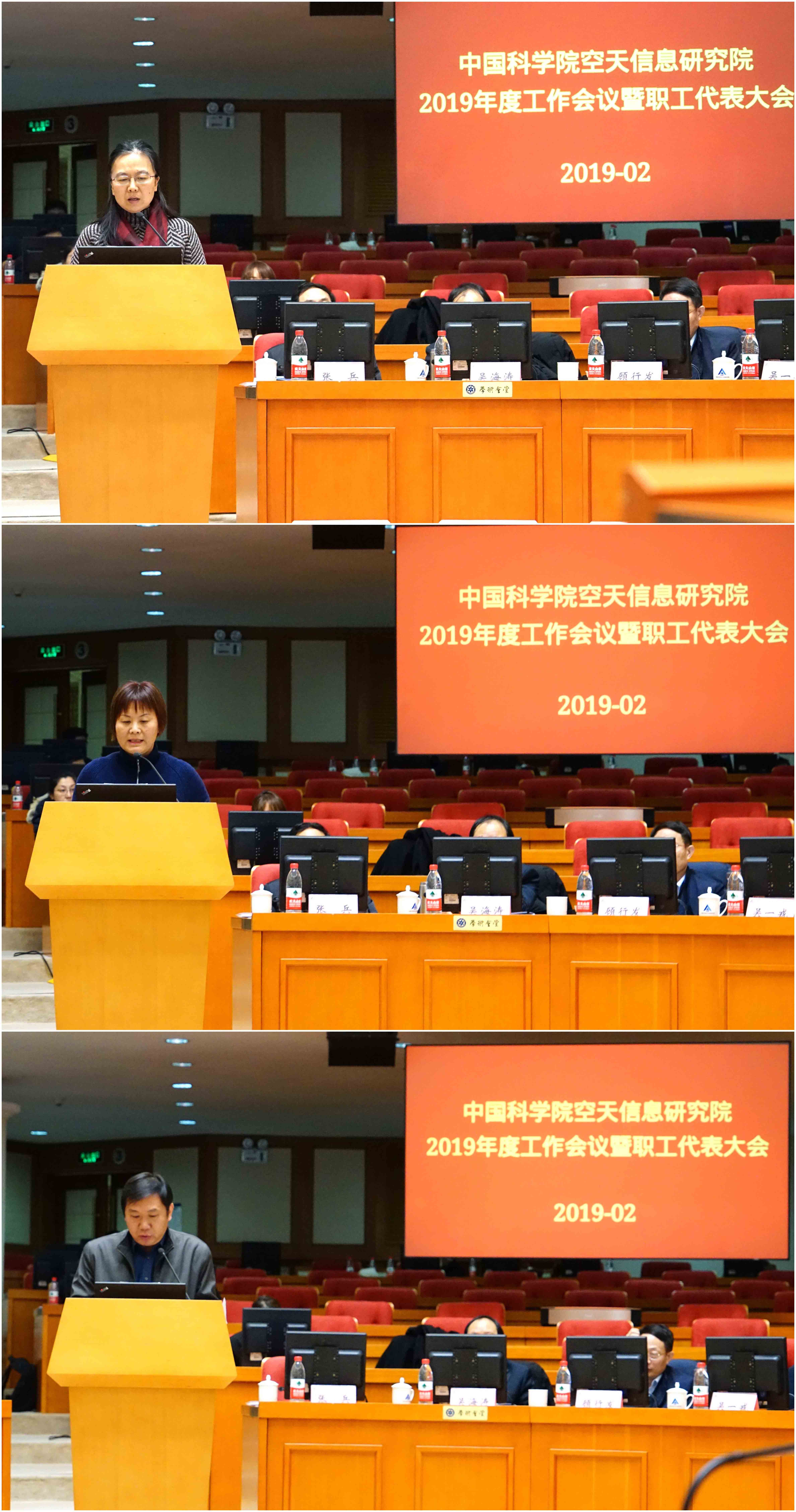 工会负责人洪文、邵芸、徐亮分别作2019年职代会工作报告及工会经费审查报告;财务处处长田永宝作空天院财务报告,介绍了财务收支情况、财务管理工作情况以及2019年度工作重点。