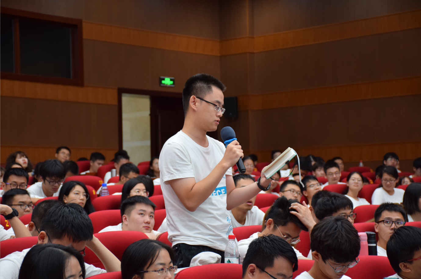 下午1时30分,国歌奏响,全场起立唱国歌,开学典礼正式开始。首先,孙应飞代表电子学院全体教师对2019级新生的到来表示欢迎,并介绍了学院的整体情况。卢葱葱为新生介绍了学院科教融合课程体系建立与思路,并指出电子学院始终坚持在科教融合战略下建立一流学院、一流学科。蔡新霞谈到,新学期每一位教师将敬业爱生,积极响应关于国家统筹推进世界一流大学和优秀学科建设总体方案的号召,投入国科大科教融合创新建设中。新生代表唐文京表示,作为一名新生将立志科研报国,呼吁同学们在这片科研净土上收获真知。