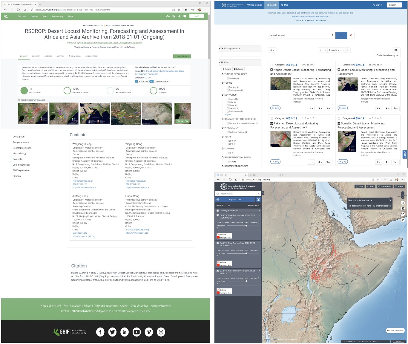 2020年2月至今,该团队针对持续肆虐亚非的沙漠蝗虫,利用中国高分(GF)系列卫星数据、美国Landsat与MODIS数据和欧空局Sentinel系列卫星数据等,结合全球气象数据和调查数据,与虫害预测预报模型相结合,基于数字地球科学平台大数据分析处理,通过具备自主知识产权的植被病虫害遥感监测与预测系统,实现大面积沙漠蝗虫繁殖、迁飞、危害的动态监测预警。团队现已发布12期亚非沙漠蝗虫灾情监测与评估报告和53组虫害时序动态监测数据集,后续将继续关注沙漠蝗虫灾情进展,并生产和发布虫害服务数据产品与科学报告,持续支撑FAO、GBIF的全球病虫防控和生物多样性保护行动。