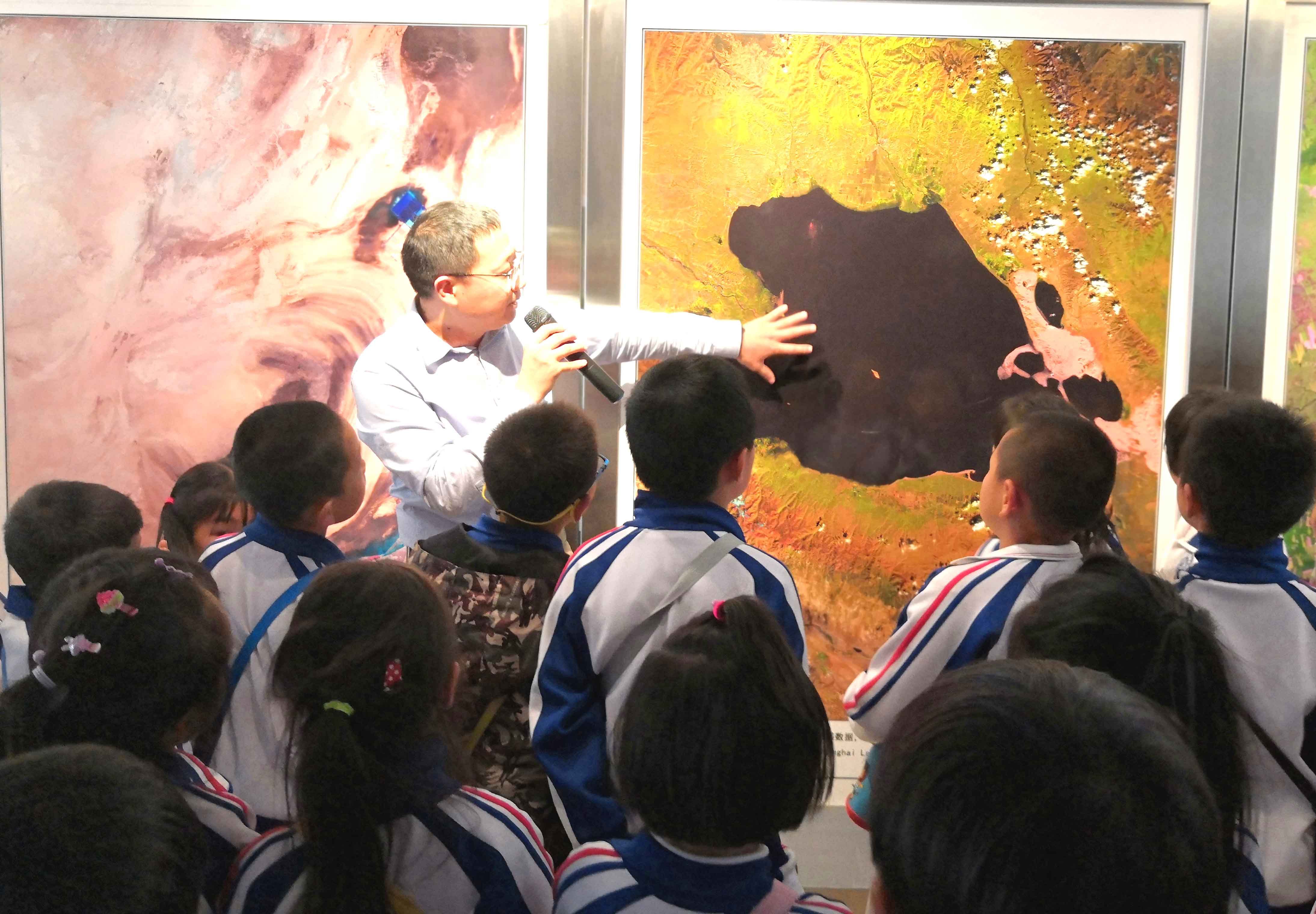 随后,在新技术园区一楼展厅,数字地球重点实验室杜小平、邱玉宝通过展板,绘声绘色地向同学们先后介绍了遥感科学与技术领域的杰出科学家、发展历程及近年成果。他们通过遥感图像向同学们详细介绍了航天、航空遥感影像的应用案例。
