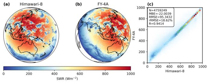 云及气溶胶是影响地表太阳辐射的重要因素,该研究团队通过近十年的努力,攻克了大气不同类型云和气溶胶粒子光散射计算理论和技术难题,综合考虑大气气体吸收、冰雪覆盖区地表反射等影响,发展了物理模型和人工智能模型相结合的新技术,研发了亚太地区太阳辐射近实时遥感监测系统,并利用我国风云四号和日本气象局葵花8/9号静止气象卫星观测资料构建了高时空分辨率遥感产品集,空间分辨率为1至5千米,观测频率为10至15分钟,实现了高精度、高频次、精细化、近实时的地表太阳辐射监测能力。