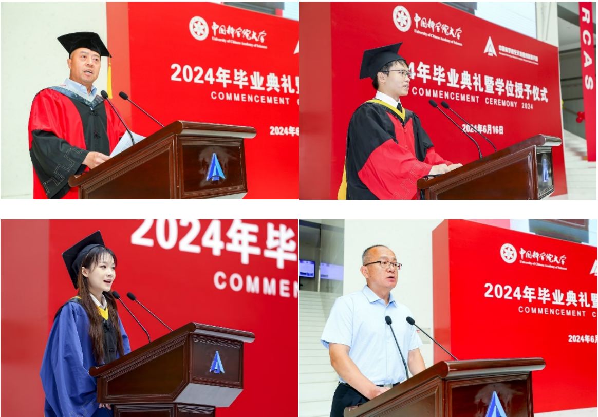 毕业典礼暨学位授予仪式上,博士毕业生代表蔡永华回顾他在科研征途上的挑战与成长,并表示将肩负时代重任,将个人理想融入党和国家的事业,运用自己的专业技能和智慧力量,在新时代书写人生的新篇章。硕士毕业生代表彭晨晨分享她从科研新手到独立思考的一路磨砺与进步的历程,表达对师长的感激之情和对同学的祝福和真挚情感。