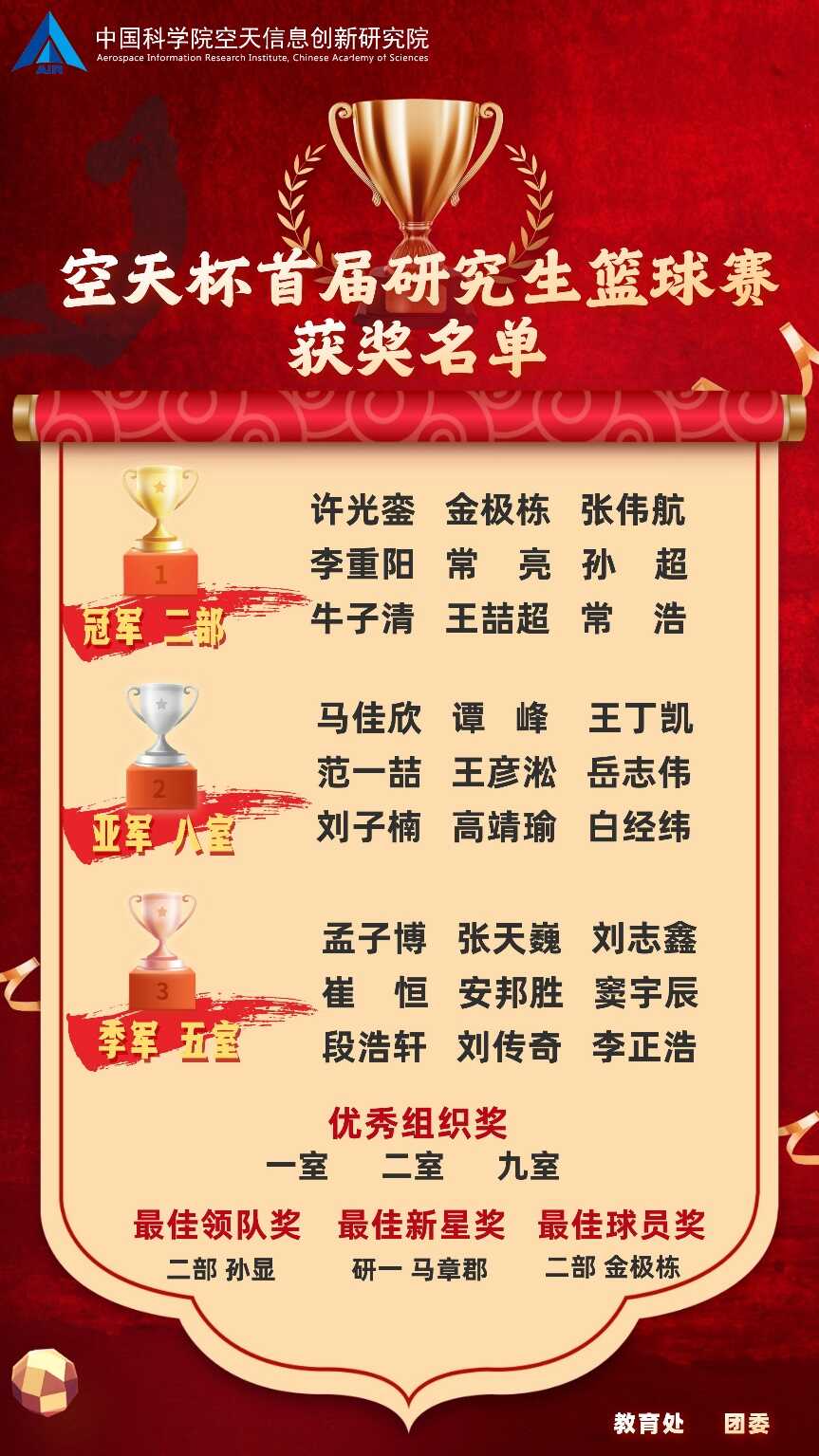 在颁发的个人奖项中,二部孙显获最佳领队奖,研一马章郡获“最佳新星奖”,冠军球队、二部金极栋获“最佳球员奖”。团队奖项中,颁奖嘉宾先后为季军、亚军和冠军球队发放奖品和奖杯。一室、二室、九室获得优秀组织奖。