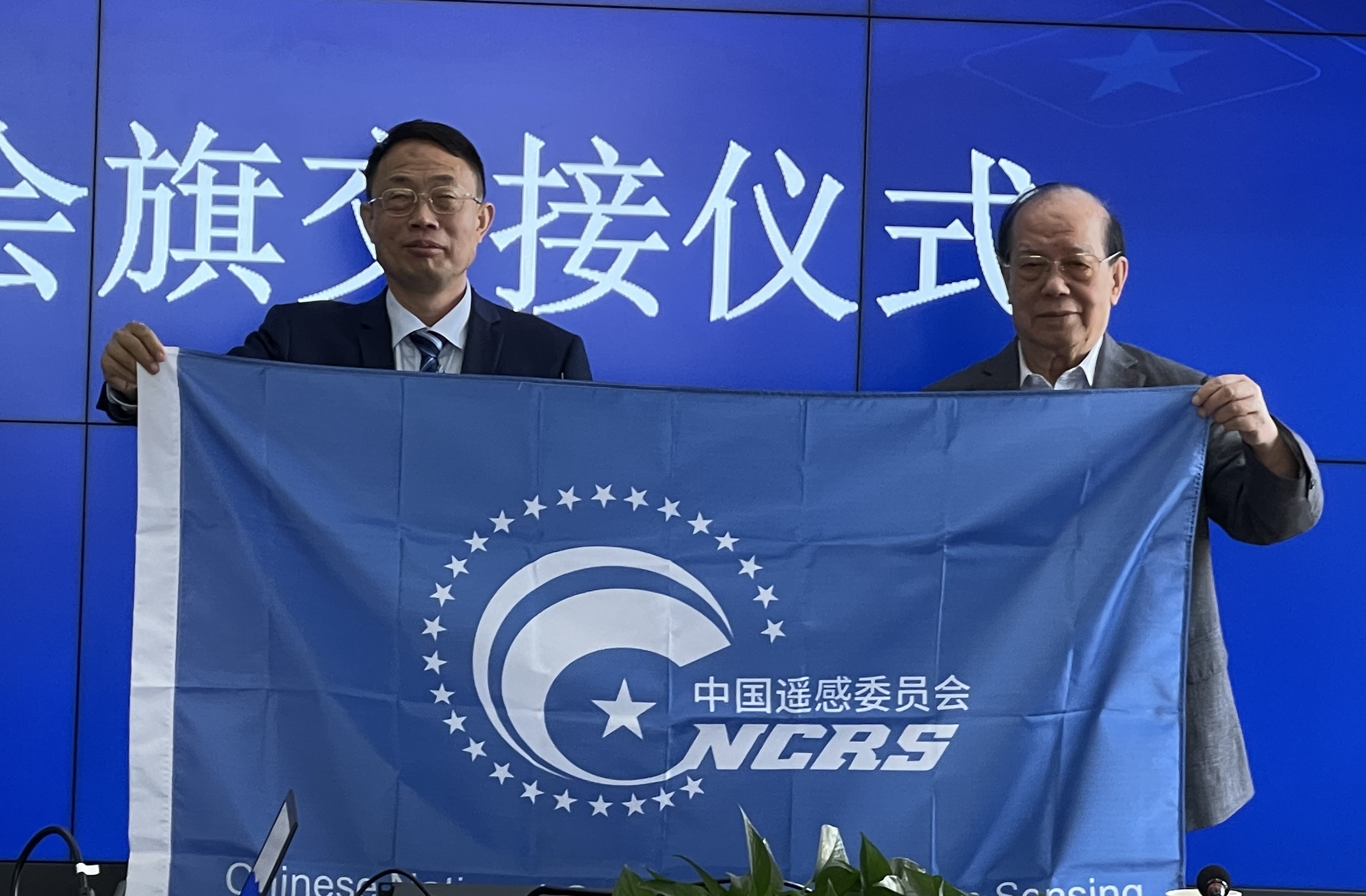 童庆禧代表第一届委员会与顾行发举行了会旗交接仪式。