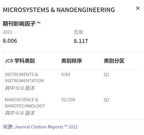 近日,科睿唯安发布2022年度《期刊引证报告》。《微系统与纳米工程(英文)》(Microsystems & Nanoengineering)的2021年影响因子取得新进展。在发稿总量增加50%的情况下,2021影响因子上升到8.006。JCR仪器仪表学科中影响因子排名第4名,持续稳居Q1区,并且连续6年蝉联“仪器仪表学科,中国期刊排名第1”。