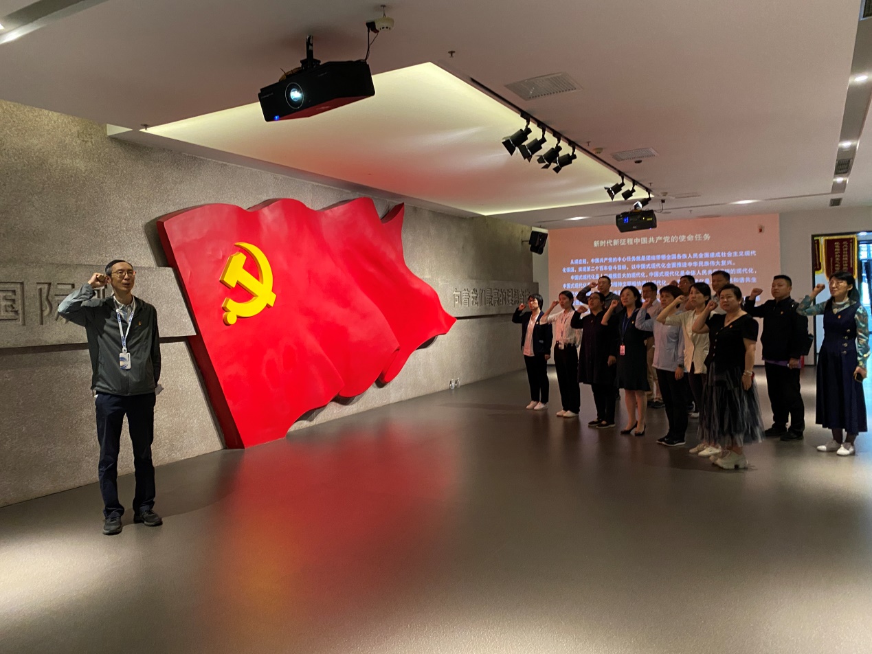 在教育基地宣誓大厅,大家面对鲜红的党旗,赵刚同志带领全体人员重温入党誓词,铿锵有力的句句誓言,不断激励大家赓续红色基因、砥砺责任担当。