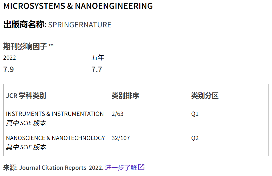 近日,科睿唯安发布2023年度《期刊引证报告》。《微系统与纳米工程(英文)》(Microsystems & Nanoengineering,以下简称MINE)的2022年影响因子为7.9。其中JCR仪器仪表学科影响因子排名首次跻身前二,持续稳居Q1区,连续7年蝉联“仪器仪表学科,中国期刊排名第1”,在持续增大发文量的同时,依然能够保持高水准、高质量发展。