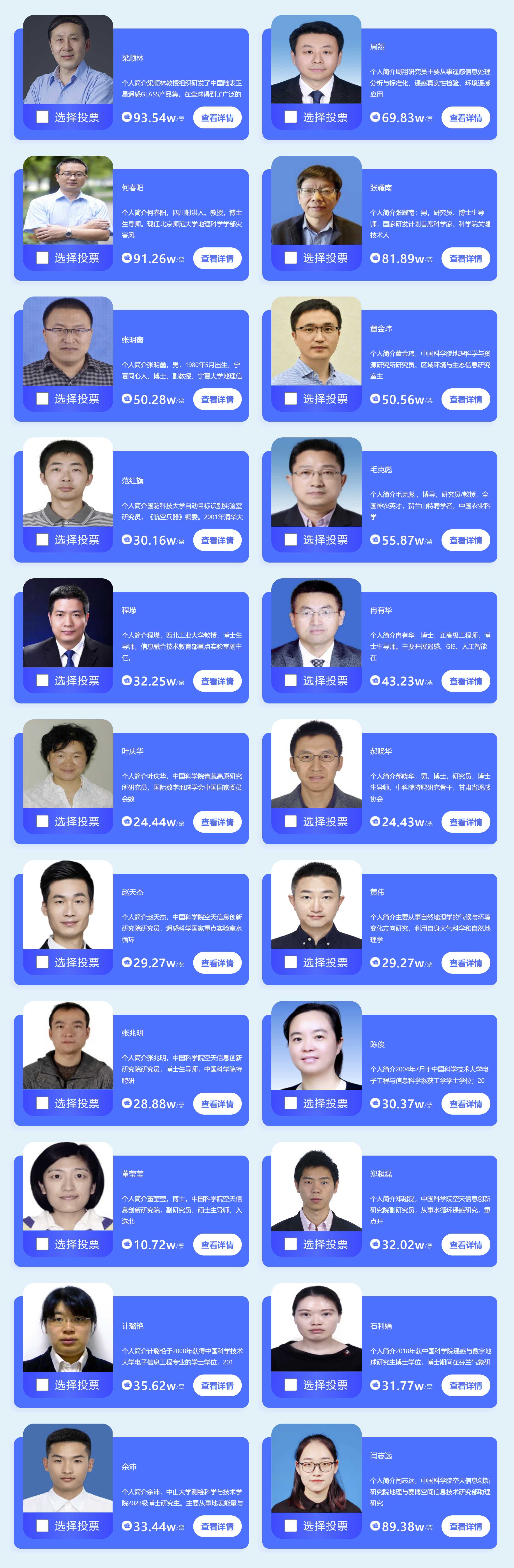 经互联网开放投票,香港大学教授、著名遥感学家梁顺林被评为中国遥感数据开放共享年度人物(共获得93.54万票),北京师范大学教授何春阳(共获得91.26万票)和中国科学院空天信息创新研究院助理研究员闫志远(共获得89.38万票)获得中国遥感数据开放共享年度人物入围奖。