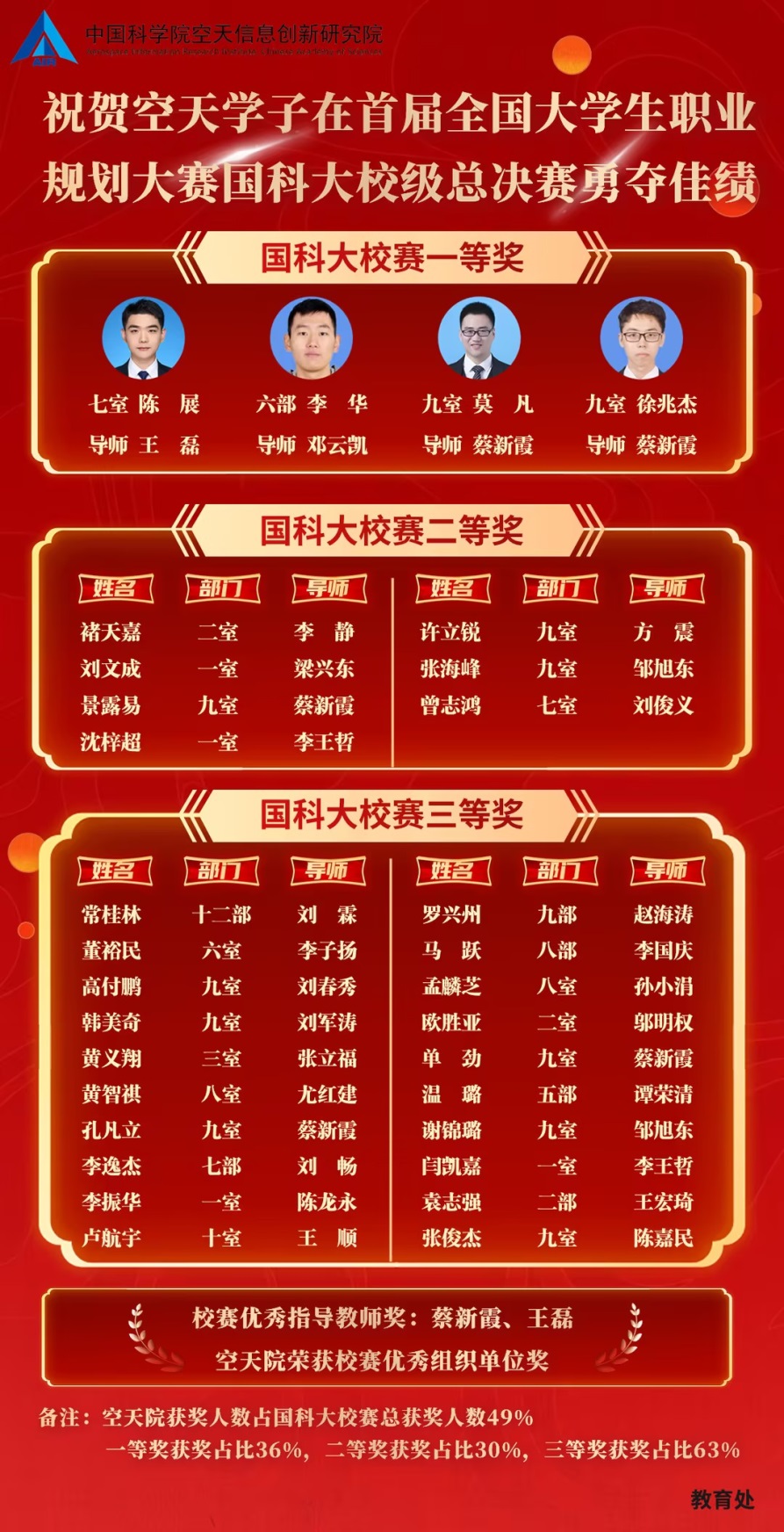 报名阶段共计空天院157名同学积极准备。56名同学在国科大校赛获得各类奖项,取得获奖人数占校赛设置奖项总数达49%的好成绩:其中,空天院研究生李华、陈展、莫凡和徐兆杰4名同学荣获一等奖,并推荐至首届全国大学生职业规划大赛北京市赛;7名同学获二等奖、20名同学获三等奖、25名同学获优秀奖;另外,空天院研究员王磊、蔡新霞被评选为优秀指导教师;空天院获校赛优秀组织单位奖。参赛同学纷纷表示通过此次大赛进一步明确自身职业目标,职业技能得到显著提升。