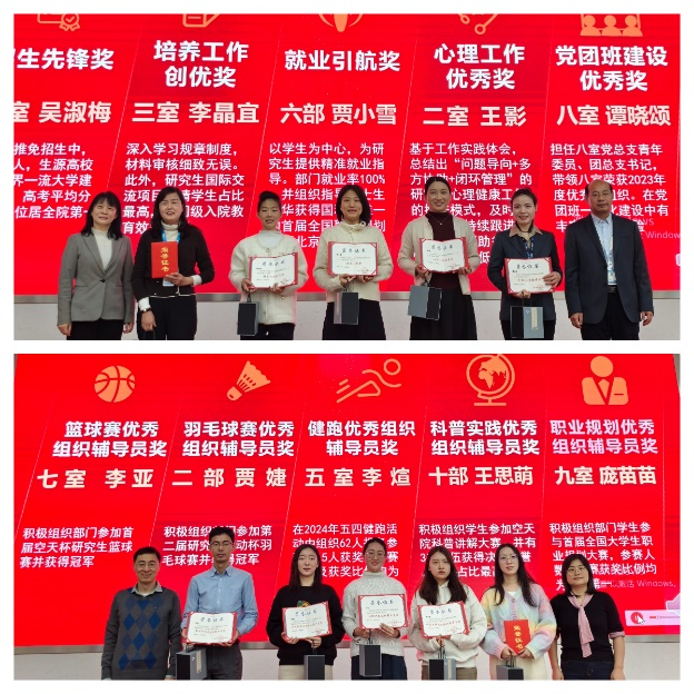 会议对在研究生招生、培养、就业、心理、党团班建设工作以及系列活动组织工作中表现出色的教育管理干部进行表彰。一室吴淑梅获得招生先锋奖,三室李晶宜获得培养工作创优奖,六部贾小雪获得就业引航奖,二室王影获得心理工作优秀奖,八室谭晓颂获得党团班建设优秀奖,七室李亚获得篮球赛优秀组织辅导员奖,二部贾婕获得羽毛球赛优秀组织辅导员奖,五室李煊获得健跑优秀组织辅导员奖,十部王思萌获得科普实践优秀组织辅导员奖,九室庞苗苗获得职业规划优秀组织辅导员奖。