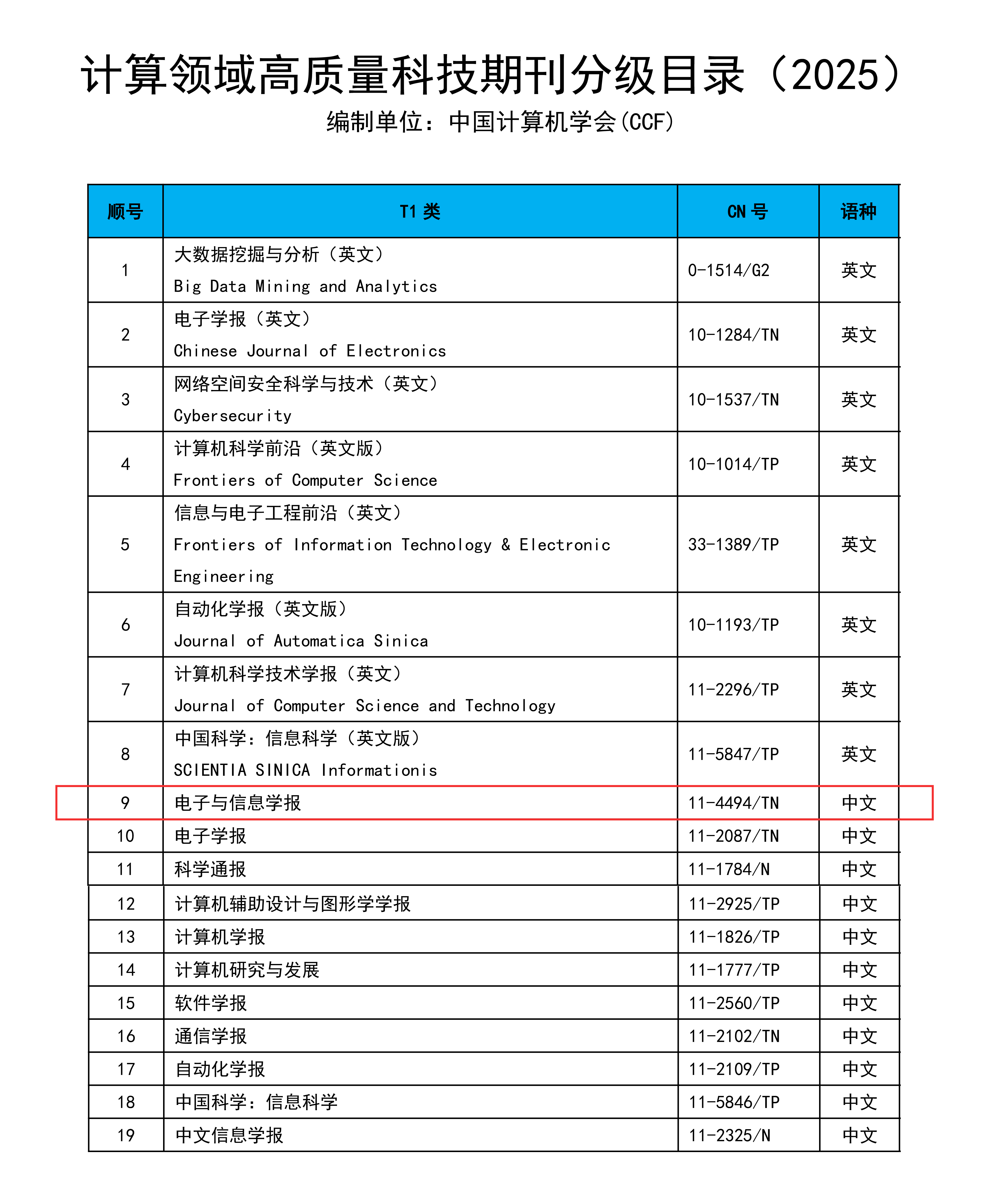 《电子与信息学报》入选CCF高质量科技期刊分级T1类榜单