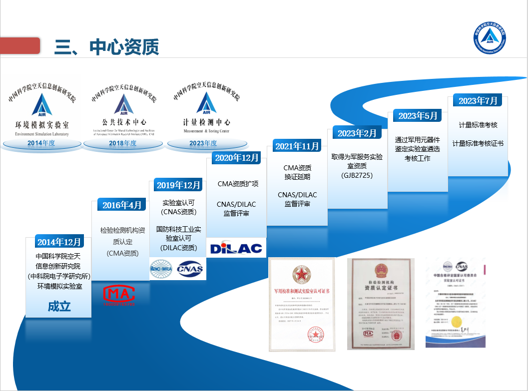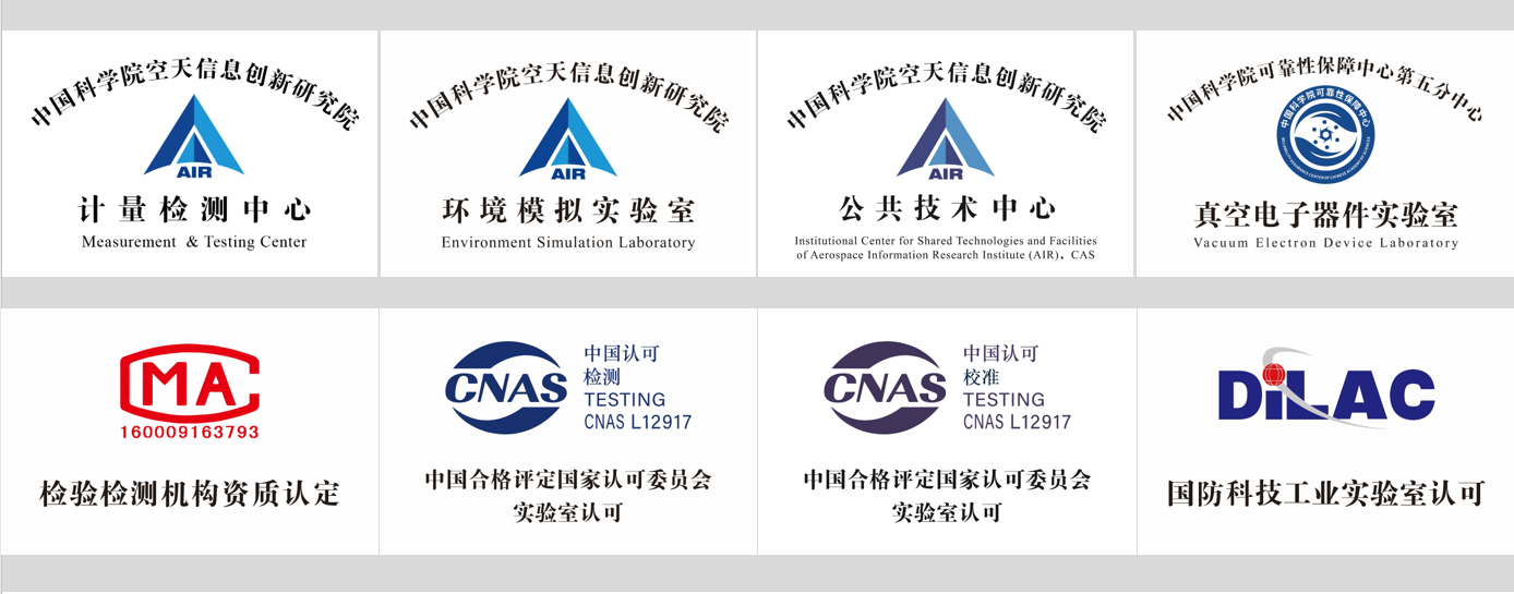 平台概况中国科学院空天信息创新研究院(空天院)计量检测中心是在环境模拟实验室基础上,2023年扩展检验检测能力,将计量组、电磁兼容组、压力传感器及智能电学量传感器与微系统组并入中心实验室体系统一管理。中心是空天院研发保障条件平台的重要组成部分,是面向社会提供检测技术服务的公共平台。中心具有检验检测机构资质认定(CMA)、实验室认可(CNAS)及国防科技工业实验室认可(DILAC)资质能力,掌握多种试验检测方法,配合院可靠性保障中心取得了真空电子元器件第三方鉴定实验室资质。