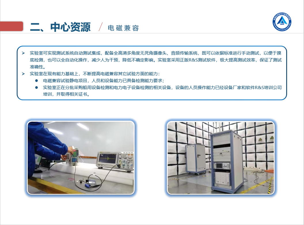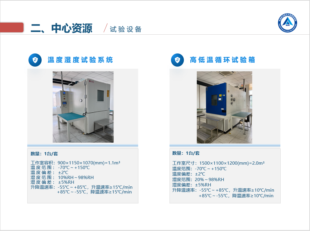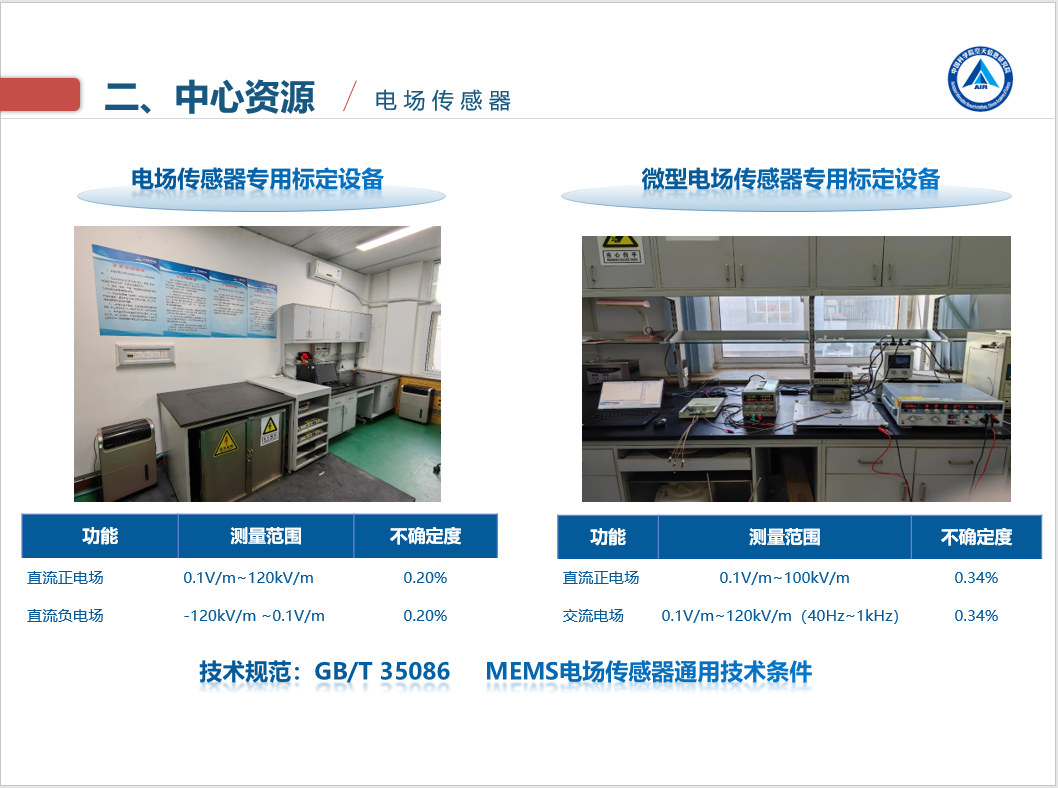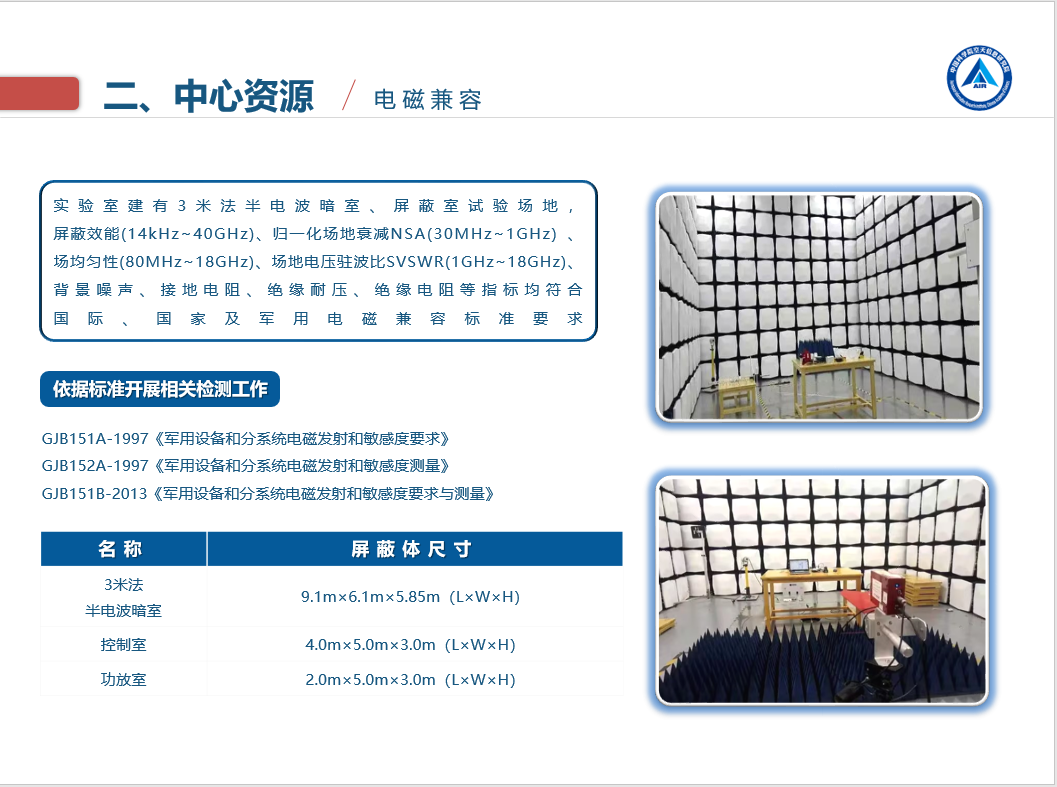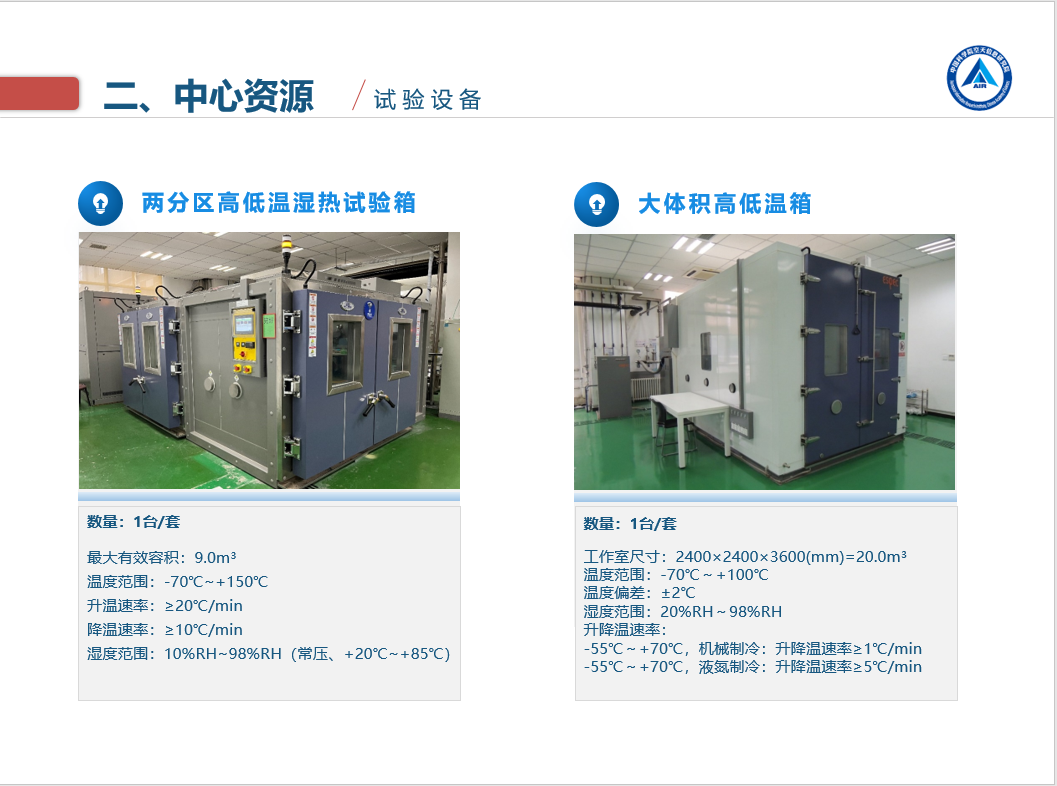 中心拥有信号发生器校准装置、同轴功率标准装置、数字多用表校准装置、示波器校准装置、数字压力计校准装置等5项,能够承担信号发生器、数字多用表、示波器、功率传感器、数字压力计等校准业务;中心能够进行电工电子、运输包装件、航空航天、轨道交通等领域产品的环境模拟试验,具体包括低温试验、高温试验、温度改变试验、低气压试验、湿热试验、温度/高度试验、温度/湿度/振动综合试验、温度/湿度/高度综合试验、振动试验、冲击试验、跌落试验、加速度试验、环境应力筛选试验、可靠性试验、热真空试验等15项;中心拥有3米法半电波暗室,能够依据相关标准开展电磁兼容检测工作;中心参与起草了国家标准,并可据此开展电场传感器检测工作。