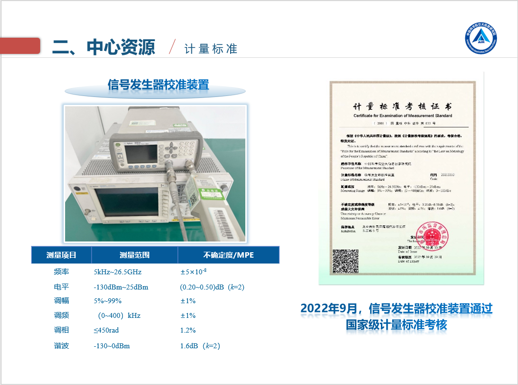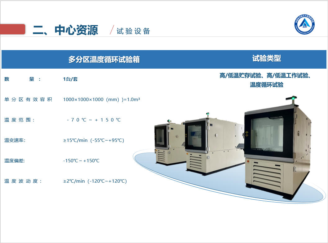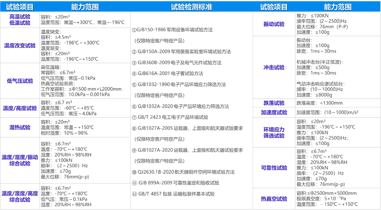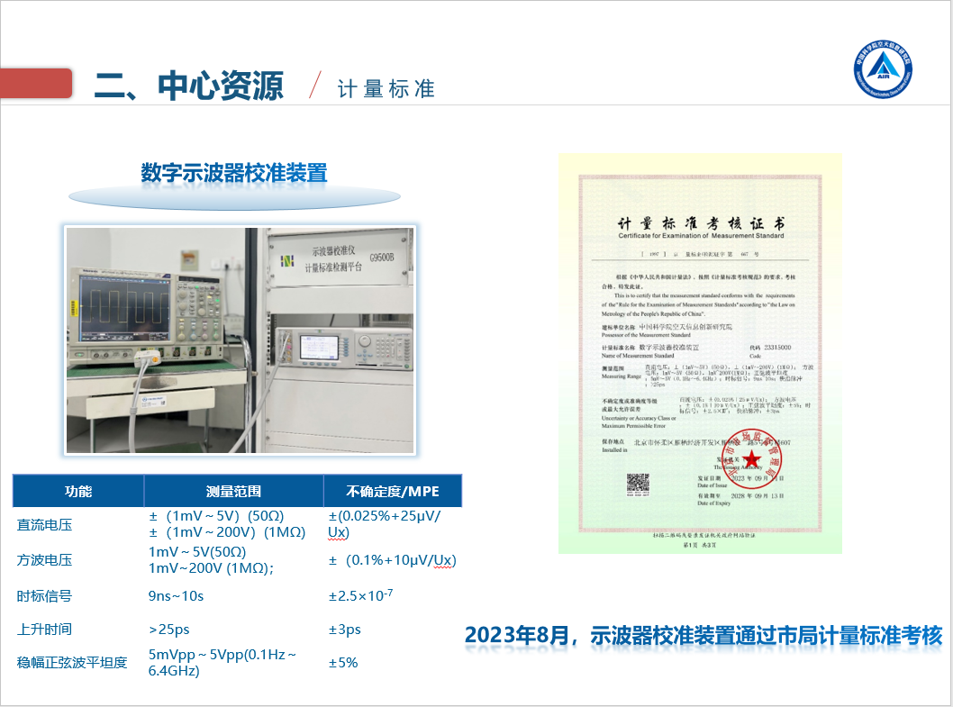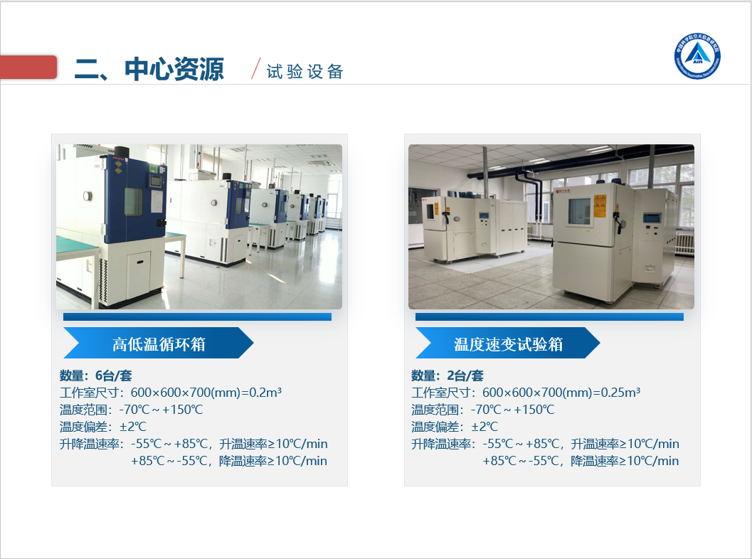 中心拥有信号发生器校准装置、同轴功率标准装置、数字多用表校准装置、示波器校准装置、数字压力计校准装置等5项,能够承担信号发生器、数字多用表、示波器、功率传感器、数字压力计等校准业务;中心能够进行电工电子、运输包装件、航空航天、轨道交通等领域产品的环境模拟试验,具体包括低温试验、高温试验、温度改变试验、低气压试验、湿热试验、温度/高度试验、温度/湿度/振动综合试验、温度/湿度/高度综合试验、振动试验、冲击试验、跌落试验、加速度试验、环境应力筛选试验、可靠性试验、热真空试验等15项;中心拥有3米法半电波暗室,能够依据相关标准开展电磁兼容检测工作;中心参与起草了国家标准,并可据此开展电场传感器检测工作。