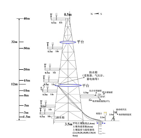 40米气象塔(115o47’32.4”E, 40o21’26.8”N)安装有:7层的风、温、湿梯度(3、5、10、15、20、30、40 m)和地表辐射温度(2个,8 m高),其中风向位于10m高处。土壤温湿梯度位于铁塔南侧3m 处,埋设深度分别为地下2、4、10、20、40、80、120、160cm。土壤平均温度探头(TCAV)埋设在地下2、4 cm。土壤热流板放置在地下6 cm。四分量辐射传感器、光合有效辐射、雨量计架设在铁塔南侧6-7 m处,其中涡动相关仪/地表辐射温度架高3.5m,四分量辐射/光合有效辐射架高4m,雨量计架高2.8m。主要仪器如下图所示。