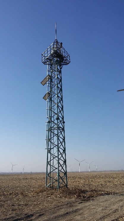 2011年11月3日至11月6日在怀来站安装了一套自制的大尺度水热通量观测系统,2012年9月19日增加了一套德国大孔径闪烁仪的观测(BLS450),与已有的自制大尺度水热通量观测系统配套,可保证观测数据的连续性。大孔径闪烁仪为东北、西南放置,发射端在东北方向(115o48’08.159”E,40o21’34.519”N),接收端在西南方向(115o46’56.871”E,40o21’07.777”N),光径路线的长度为1870m,与正北方夹角约63度,架高(有效高度)14m。如下图所示。