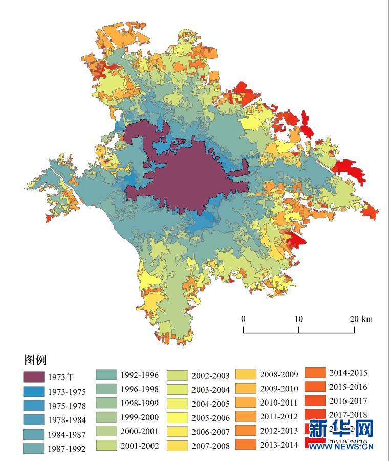 这是中国典型城市扩展遥感监测数据库里1973-2020年北京市城市扩展示意图。